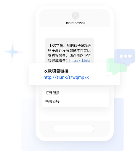 忘缴、漏缴一键通知,在系统中筛选出未缴费学生,点对点发送缴费短信,点开链接即可直接缴费。