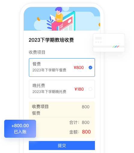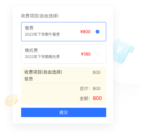 订奶、校车、餐费、晚托费等学生自愿消费场景下,可以指定那些收费项目可选择,哪些收费项目必选,家长按需选择,提交即可完成支付。