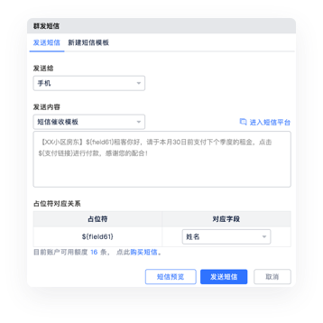 一键发送催费短信,一键生成纸质催收单,一键生成律师函,一键生成诉状,层层递进1个人就可以完成催收工作